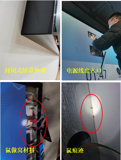 3.拆除大屏幕的组建显示面板之余,发现有布置年会喜庆的材质和鼠粪便留存在大屏幕内部。